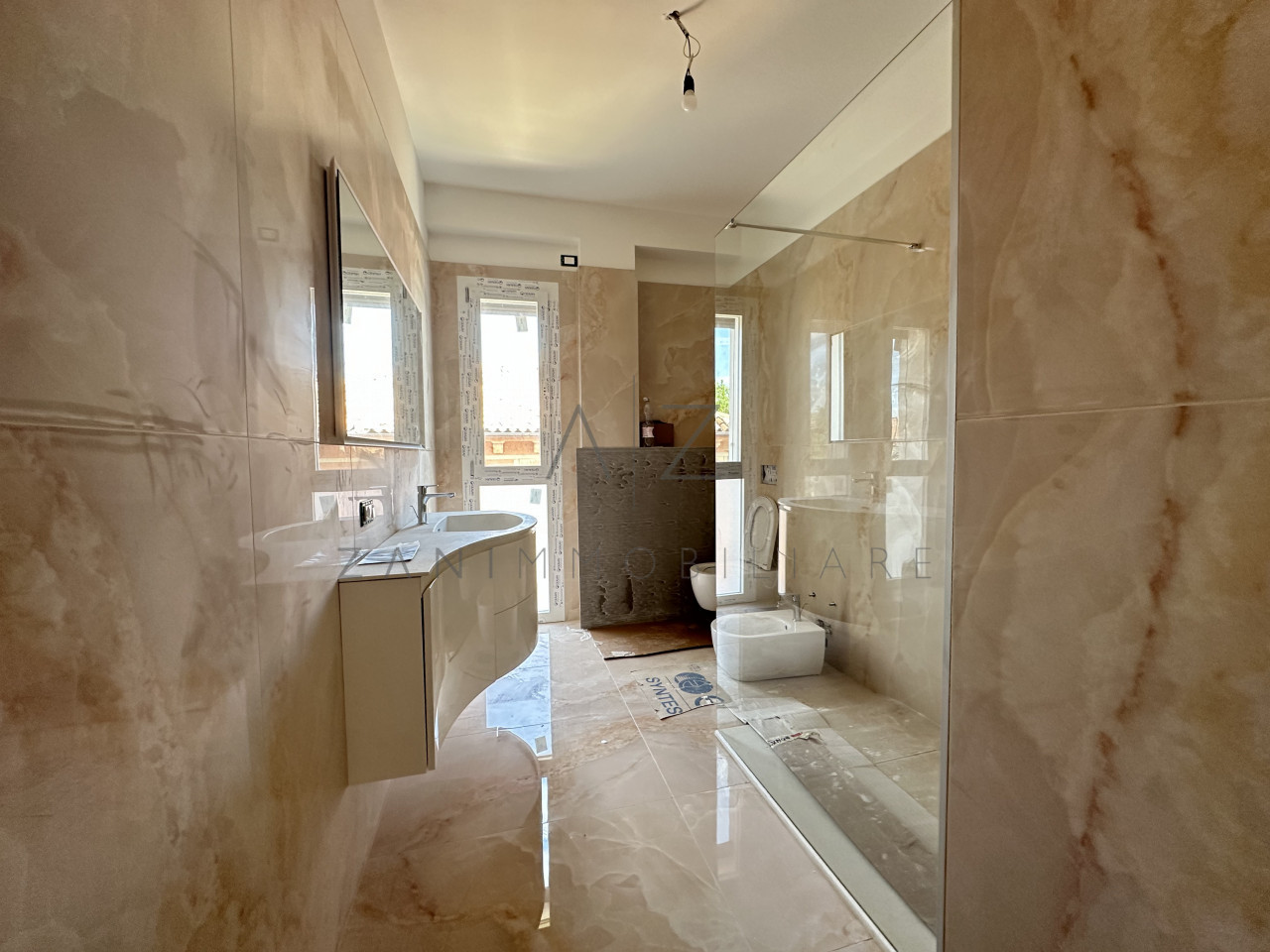 Un disimpegno di 5 mq porta alla zona notte, in cui troviamo due bagni con doccia, una prima camera di 10 mq con accesso al secondo terrazzo della proprietà, rivolto ad Est, una seconda camera di 16 mq e la padronale di circa 20 mq.